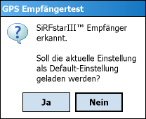 Test Überprüft ob die in GPS port spezifizierte GPS-Datenquelle funktioniert. Wenn ein SiRF GPS-Empfänger erkannt wird, so besteht zusätzlich die Möglichkeit die aktuelle Konfiguration des SiRF-Empfängers als Default-Einstellung zu speichern. Ist in GPS port eine Datei als Datenquelle festgelegt worden, so überprüft dieser Test, ob die angegebene Simulationsdatei NMEA-Daten enthält.