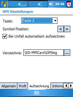 Taste Legt die Taste am Pocket-PC fest mit der die Aufzeichnung der NMEA-Daten gestartet und angehalten werden kann. Wird hier keine Taste spezifiziert, so ist die Aufzeichnungsfunktion für das entsprechende Profil ausgeschaltet und alle weiteren Eingaben dieser Seite deaktiviert. Außerdem verschwindet das Aufzeichnungssymbol aus der Taskleiste. ● Wird während der Aufzeichnung das Aufzeichnungssymbol über den Stylus selektiert, so wird die aktuelle Aufzeichnung beendet und das Symbol wird von der Taskleiste entfernt.