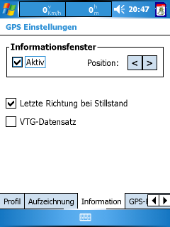 Letzte Richtung bei Stillstand Simuliert dem GPS-Programm die zuletzt ermittelte Bewegungsrichtung mit einer Geschwindigkeit von ca. 0,5 Km/h falls sich der GPS-Empfänger sich nicht bewegt. Dies bewirkt bei Programmen wie Fugawi, daß die letzte ermittelte Bewegungsrichtung durch einen Pfeil auf der Karte dargestellt wird.