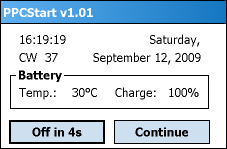 Off sets the Pocket PC into Standby. Continue terminates PPCStart.