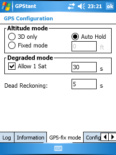 The adjustments on this tab have only effect when a GPS receiver with a SiRF chip-set is used. On this tab all adjustments for the GPS-fix mode can be made.